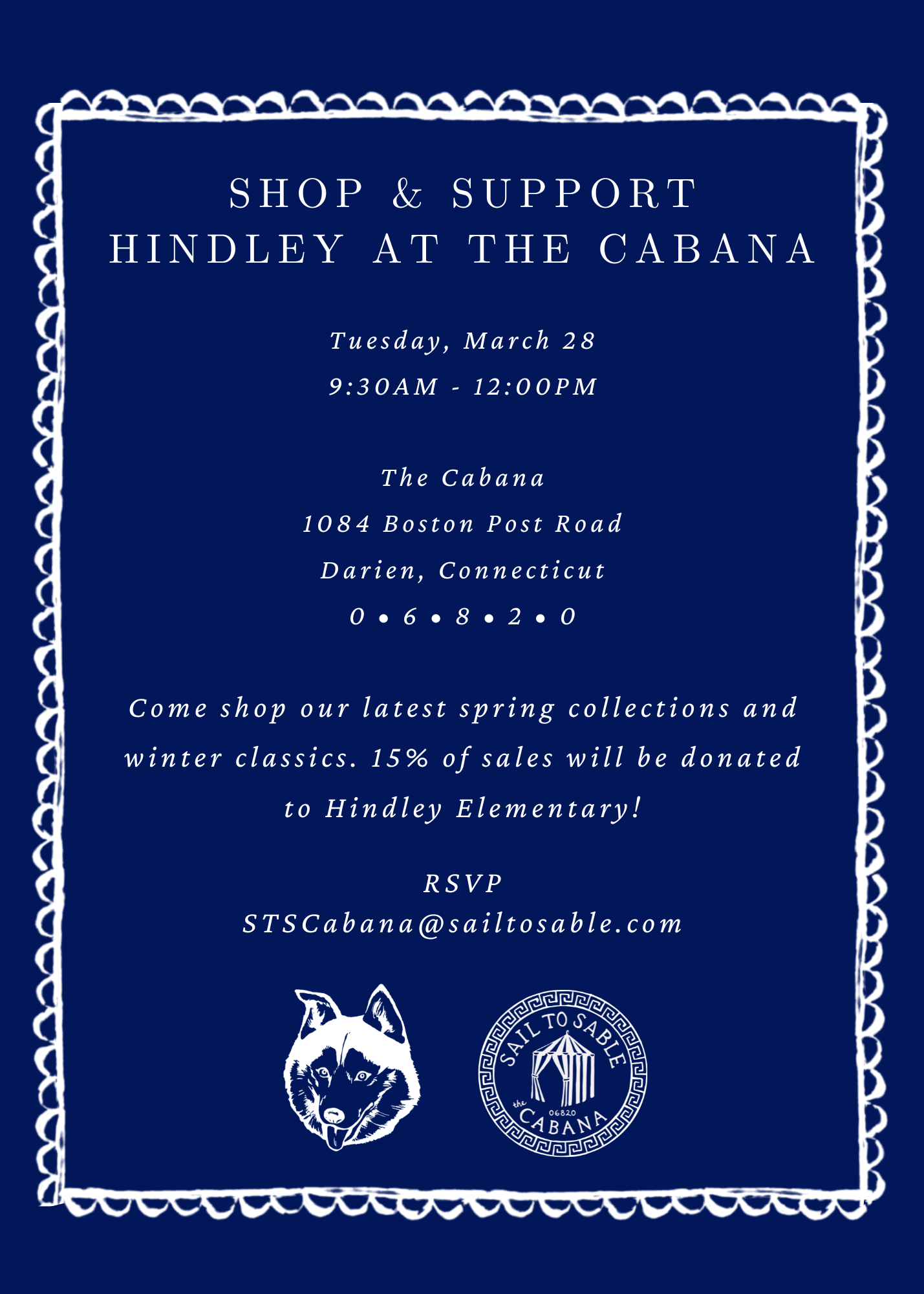Mark your calendars for Tuesday, March 28th for a shopping event at The Cabana from 9:30am – 12:30pm. Pop in and grab a coffee while checking out new spring styles and winter classics. This is a fun, easy way to support Hindley as 15% of all purchases go to the Hindley PTO to benefit our kids. RSVP encouraged at STSCabana@sailtosable.com