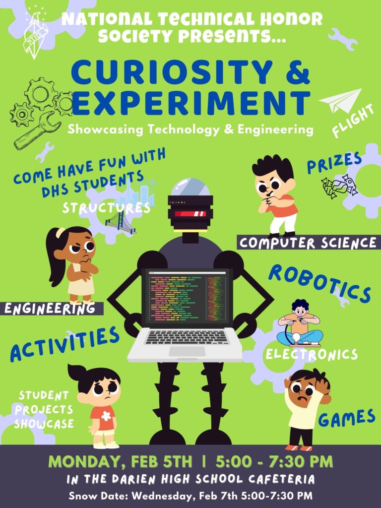On February 5th, the National Technical Honor Society will host “Curiosity & Experiment” at DHS from 5:00 – 7:30 PM. This will be an event filled with STEM activities for Middle School and Elementary students, as well as a DHS Independent Projects in Engineering showcase. There will be games, robotics, engineering, electronics, computer science, structures, flight, prizes, and more! Please reach out to Sarina Thomas or Ashley O’Connor if you have any questions.